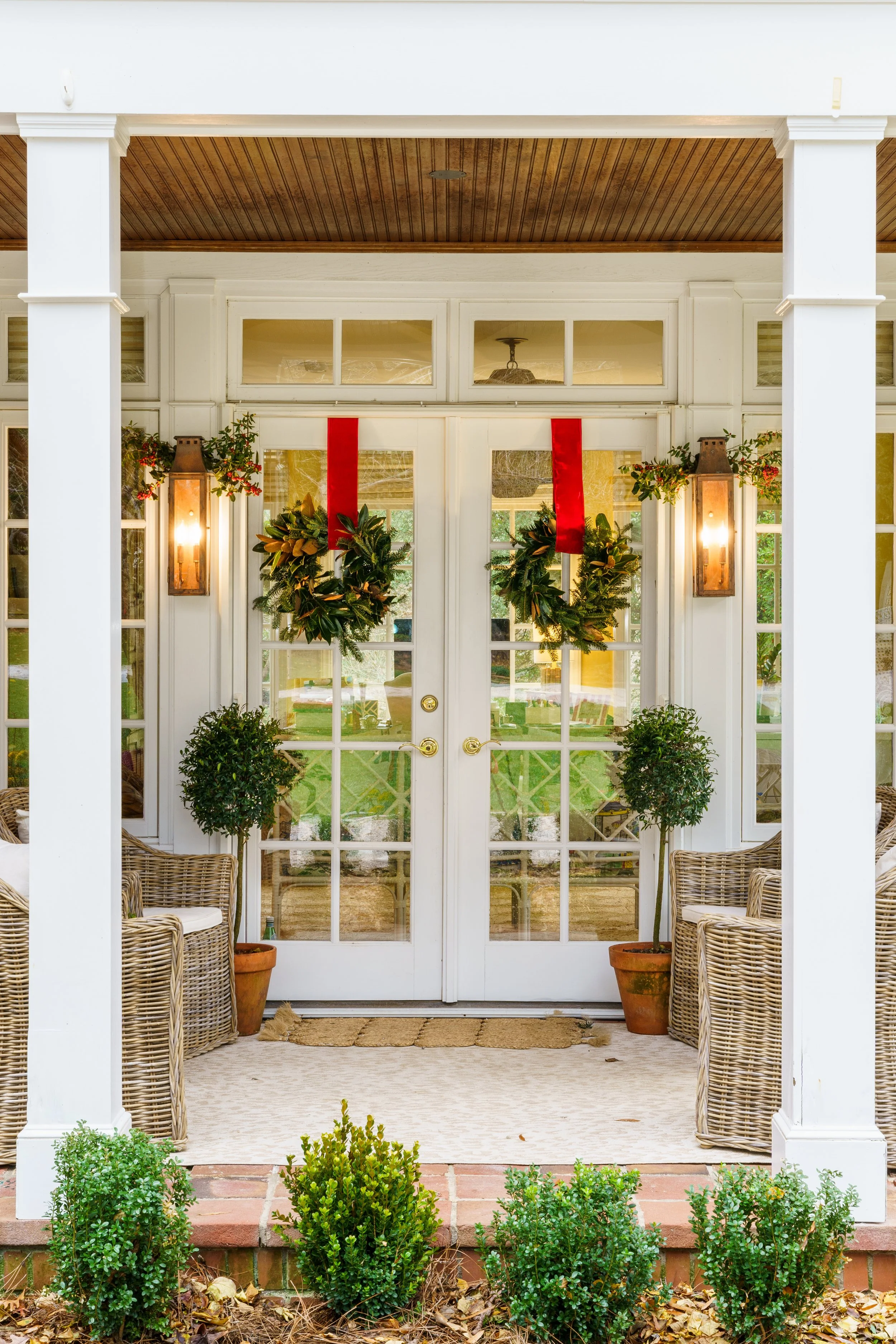 “The front door sets the tone for your entire home, especially during the holiday season," explains Grey Joyner of Grey Joyner Interiors. "It’s the first impression your guests receive, so you want it to be welcoming and memorable. I like to set the tone with lush garlands, seasonal colors, and a touch of personal flair."